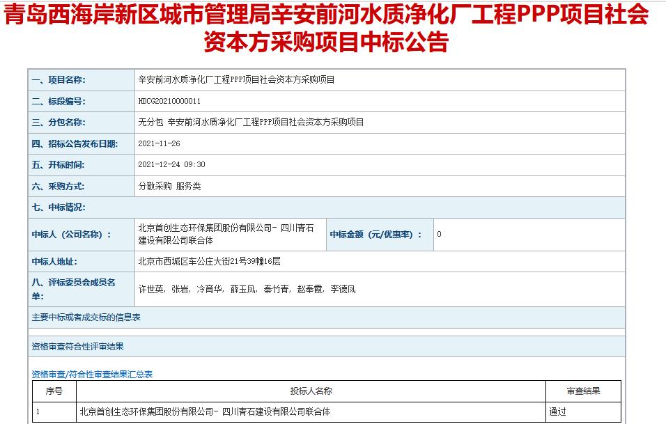 1月17日,青島市公共資源交易電子服務(wù)系統(tǒng)發(fā)布了青島西海岸新區(qū)城市管理局辛安前河水質(zhì)凈化廠工程ppp項目社會資本方采購項目中標公告,中標供應(yīng)商為北京首創(chuàng)生態(tài)環(huán)保集團股份有限公司- 四川青石建設(shè)有限公司聯(lián)合體。